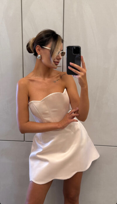 Astuge elegantsesse maailma meie 'Milena' mini-kleidiga. Luksuslikust satiinist valmistatud õlapaelteta disain toob kaunilt esile õlad.