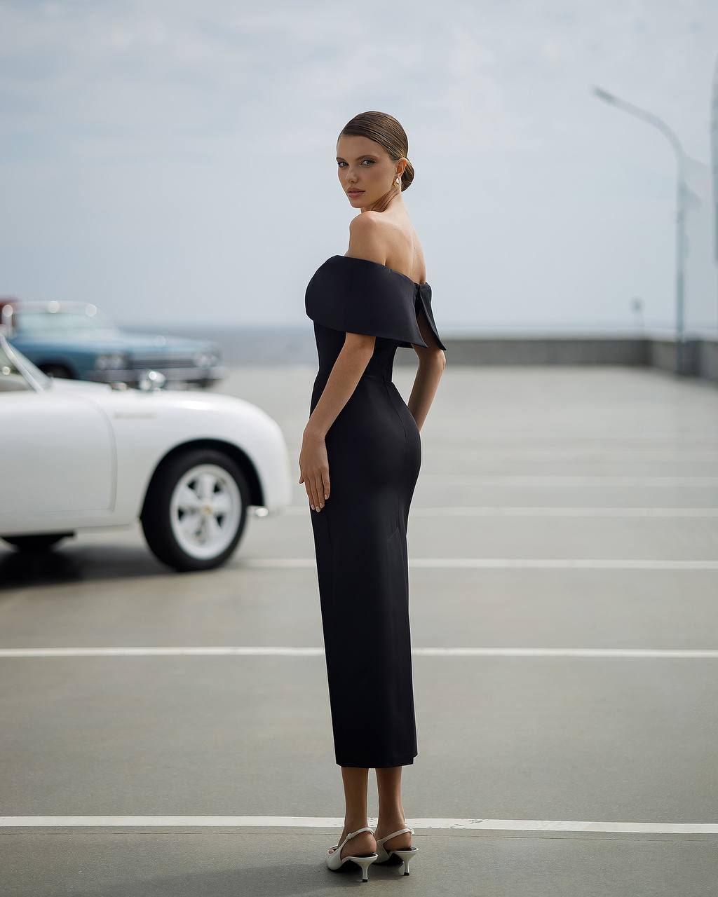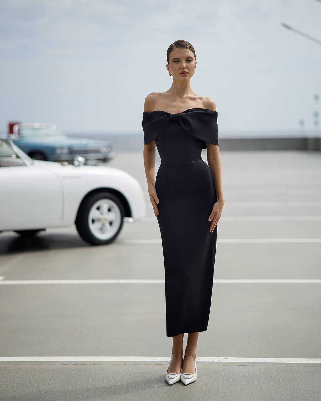 Our Aubrey midi dress is the epitome of modern elegance. Cut from premium crepe, it features a romantic off-the-shoulder neckline framed by a sculptural oversized bow for a statement finish.